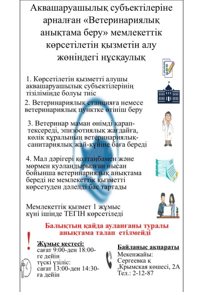 «Ветеринариялық станциясы» КММ (Сергеевка қ.) және СҚО әкімдігі ветеринария басқармасы» КММ «Ветеринариялық анықтама беру» мемлекеттік қызметі бойынша жауапты тұлғалардың байланыс деректері