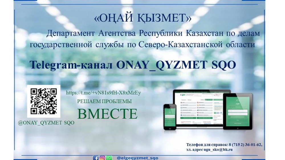 Департаментом Агентства Республики Казахстан по делам государственной службы по Северо-Казахстанской области для оперативной помощи населению по разъяснению оказания государственных услуг, улучшению информированности населения и получению обратной связи создан Telegram канал