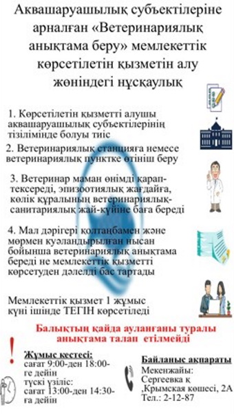 Аквашаруашылық субъектілеріне арналған «Ветеринариялық анықтама беру» мемлекеттік көрсетілетін қызметін алу жөніндегі нұсқаулық